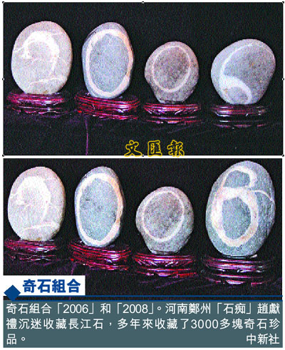 奇石組合「2006」和「2008」。河南鄭州「石痴」趙獻禮沉迷收藏長江石,多年來收藏了3000多塊奇石珍品。 中新社