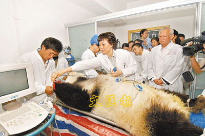 ■日前,生活在福州大熊貓研究中心的大熊貓巴斯被送往解放軍南京軍區總醫院接受體檢,這是中國最老的大熊貓接受身體檢查。圖為醫生為大熊貓巴斯作心電圖檢查。 本報特約記者林小宇 攝
