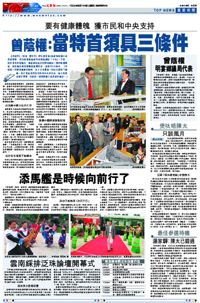 【本報訊】(記者 遲宗平)明年便是第3屆香港特區行政長官選舉,現任特首曾蔭權早被視為頭號「大熱」。不過,對於是否角逐連任,曾蔭權在接受訪問時維持一貫的謹慎風格,笑說連任與否要聽候命運安排,並視乎3大條件:「作特首一定要有健康的體魄,我十分幸運這一刻我已經有了健康。其次是能否得到市民和中央的支持,這三項因素都好重要,任缺其一都會影響行政長官的管治。」