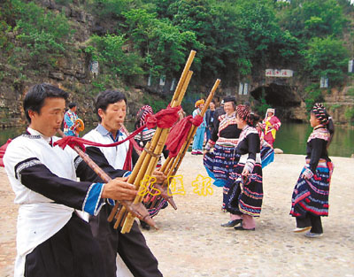 ■當地少數民族男女在珠江源載歌載舞,迎接賓客。 本報記者 譚旻煦 攝