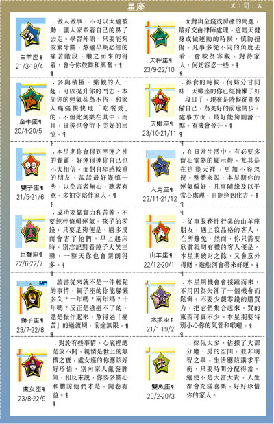 本星期機會會接踵而來,不用因為失卻了一個機會而鬆懈。不要少覷零錢的購買力,把它們集合起來,買的東西可真不少。本星期要特別小心你的氣管和喉嚨。