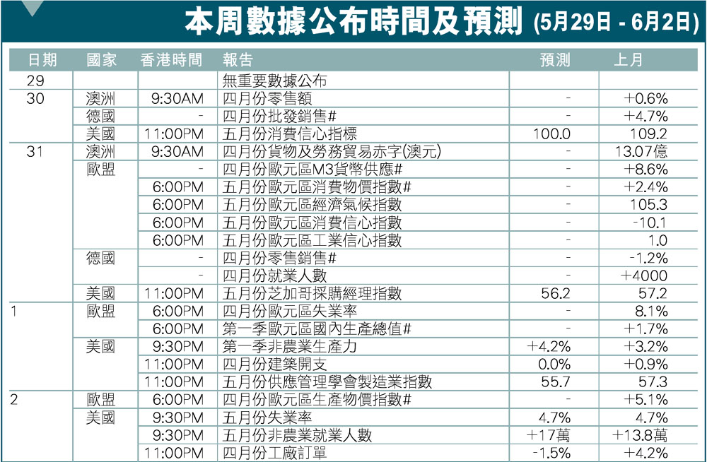 本周數據公布時間及預測(5月29日 - 6月2日)