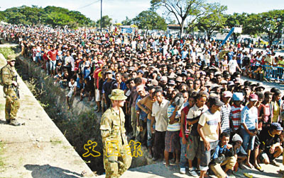 ■數以萬計的東帝汶人排隊等候派米,澳洲士兵負責維持秩序。 美聯社