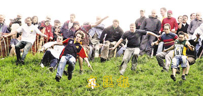 英國西部格洛斯特郡在剛過去的「春假」(即5月最後一個星期一)舉行了一年一度的滾芝士大賽,數十名參賽者在200米斜坡追逐一塊重9磅「車胎」型芝士,還有3千多人在旁歡呼助興,大賽中有25人受傷。 法新社