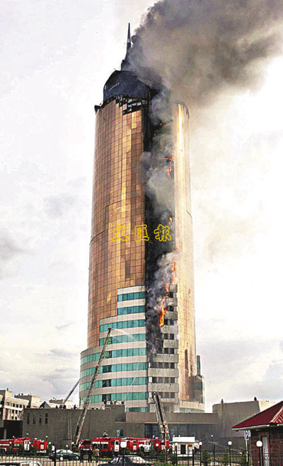 哈薩克首都阿斯塔納38層最高建築大樓被當地人暱稱為「打火機」,但昨日真的名副其實著火了,大火吞噬了大樓的頂層及大樓其中一邊一半的辦公室,碎片從大樓頂層上掉下來,兩名消防員被割傷。當局派出10輛消防車被派到場撲火,由於大樓高130米,雲梯及消防喉未能到達著火地點,消防員需從地面將消防喉拖上大樓撲火。 ■綜合外電消息/路透社