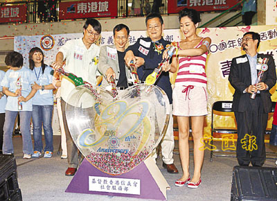 ■曾鈺成與年青人討論「青年不發聲」的問題外,又與眾嘉賓為基督教信義會30周年活動,主持揭幕儀式。本報記者張立新 攝
