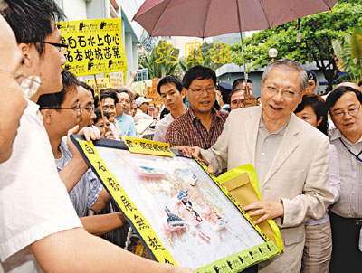 ■團體趁房屋及規劃地政局局長孫明揚到沙田主持龍舟比賽,向他請願。 本報記者李志樑 攝