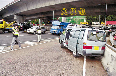【本報訊】一部客貨車昨午在九龍呈祥道西行,途至蝴蝶谷道時失事撞壆,繼而打「白鴿轉」180度逆向停下,司機雖無恙,但車上3名婦孺均受傷送院。