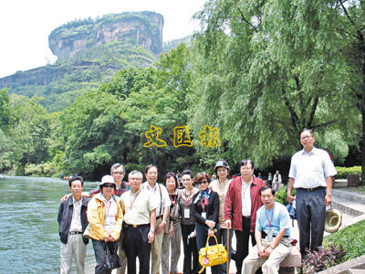 訪問團25日雨夜飛抵武夷山市,入酒店時已過了12點。翌日,春雨依然瀟瀟。團友向天游峰出發,為安全計,部分人坐轎由後山登頂;冒雨循前山攀登險峰者一共八人,包括副團長張勝權伉儷、副會長單志明等,結果八人俱在汗水夾雨水下,「濕身」成功登頂。