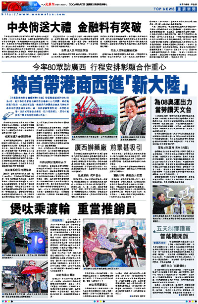 【本報駐廣西記者雷輝南寧1日電】特首曾蔭權將於6月2日至4日,首次率80名香港企業代表及專業人士代表團,前往廣西進行訪問。此間分析認為,廣西向代表團推出最具代表性和最有合作價值的地區和行業,包括參觀會展設施、考察防城港、訪問成功港資企業等,從行程安排上,就可以看出新一輪桂港合作的重心所在。