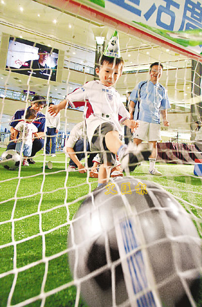 世界盃期間,一個商場將會舉辦「全港BB球王爭霸戰2006」,邀請100對5至12個月大BB及父親進行比賽,參賽隊伍精心設計趣致足球造型父子裝,並進行射龍門比賽,競逐BB足球王冠軍寶座。圖為一名小朋友大腳將球射入龍門。 本報記者羅蘭蓉 攝