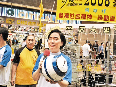 繼特首曾蔭權以觀賞世界盃談管治香港後,劉慧卿昨日下午率前線成員於旺角行人專用區,架起龍門,呼籲市民購買籌款波衫以及參與本星期日的六四燭光晚會及下個月的7.1遊行。「前線2006籌款活動」由劉慧卿射龍門作開幕,雖然活動甚具噱頭,但只吸引數十位市民圍觀。被問到有關上星期的「六四遊行」只有數百人參加,會否擔心今年的七一遊行同樣乏人問津時,劉慧卿表示市民「向來非常有心」,故自己並不擔心。 ■本報實習記者 陳芷琪