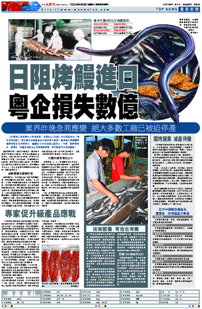 烤鰻出口方面,因為日本對烤鰻檢測設備尚未到位,而且具體檢測項目還未出台,隨時都有可能變化。所以廠家都持觀望態度,廣東絕大部分烤鰻加工廠已停產。某食品進出口公司水產業務負責人稱,在不開工的情況下,工廠一個月維持費大概需要一百多萬人民幣。