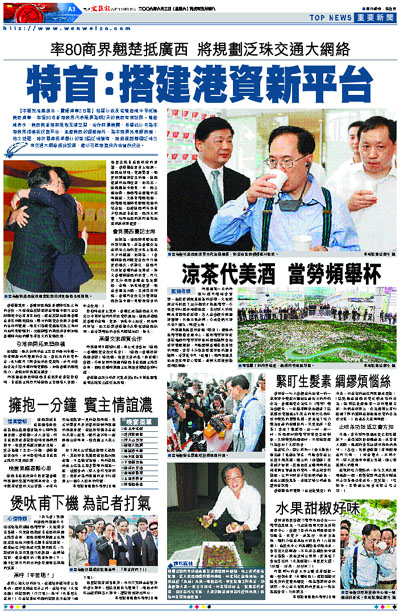 【本報記者葉傲冬、雷輝南寧2日電】特區行政長官曾蔭權今早抵達廣西南寧,率領80名香港商界代表展開為期2天的廣西考察訪問。曾蔭權表示,廣西與香港有很強互補空間,合作前景廣闊,希望此行可為本港商界搭建新投資平台,並藉廣西的優勢條件,為本港開拓東盟商機;他又透露,將於雲南昆明舉行的第3屆泛珠論壇,將對規劃整個泛珠三角交通大網絡提出設想,藉以引導港資向內地省份投放。