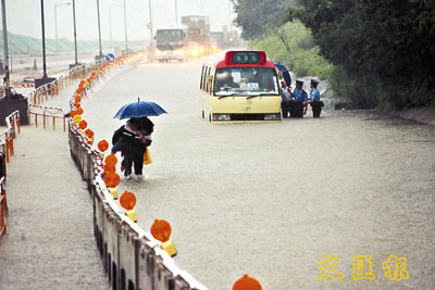 【本報訊】受一道低壓槽影響,本港昨日暴雨連場,天文台於上午20分鐘內接連發出黃色及紅色暴雨警告約5小時,其間又發出山泥傾瀉警告。在暴雨肆虐下,荃灣、沙田、大埔及西貢等地均成為重災區,由昨日凌晨開始錄得超過150毫米雨量;在青山公路沿線的汀九村及沙倉段,分別有村民遭受山洪及小巴乘客遭洪水圍困,需由警方及消防員救離險境。