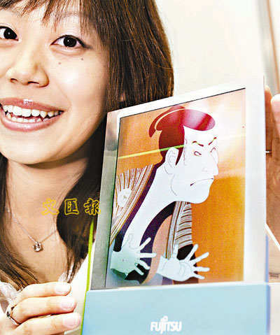 圖中所示由日本電腦生產商Fujitsu所研發的「電紙」:以7.8吋512色VGA、「膽固醇狀晶體」(cholesteric)液晶顯示屏,可在沒有電源下持續顯示影像。據Fujitsu公布的消息,「電紙」具彈性,屈曲或以手指壓下亦無礙顯示。傳媒有恐科技一日千里,像這樣的「電紙」會把報紙淘汰。事實上,科研乃商業策略之一,要真正取代某些東西,還得看市場反應與普及程度。 ■綜合外電消息