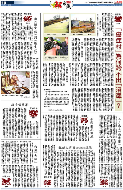 翻開報紙,常看到刺痛心靈的字眼:「癌症村」。《健康時報》刊登了天津市北辰區西堤頭鎮劉快莊村和西堤頭村兩個「癌症村」的報道,西堤頭村這五年死於癌症的約有近三百人,已患癌症但還活著的有六十至八十人,而劉快莊村死於癌症的在一百五十人以上。上個月,新華社還報道了廣東省翁源縣上壩村這個「癌症村」,曾是一個水草豐美的魚米之鄉,當地民間曾有歌謠流傳:有女要嫁江河村,不愁吃來不愁穿。可如今,上壩村卻成了遠近聞名的癌症村、貧困村。村幹部說這已是今年來第六個死於癌症的人了,而且目前又有幾個人陸續被診斷出患了癌症,還有三個在等待死亡。