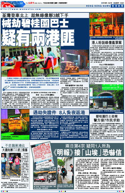 談到昨晚的經歷時,陳太猶有餘悸地表示:「當時車上安靜如常,坐在前排的一名年輕人突然走到司機旁,拿著槍說『搶劫!咪多事,唔係就打爆你個頭。』」陳太續稱:「同一時間,車內不同位置又有4人站起來,各人都持刀槍,然後就搜我們的手袋……」,「當時覺得劫匪中有兩個人很面熟,但當時不敢多想,事後才記起這兩人在荃灣乘直通巴士時就一路跟隨。」