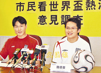 ■青年民建聯雖舉辦「賞波夜」,但委員梁子穎(左)與陸偉傑均認為,政府應加強宣傳,向市民傳達「只睇波、不賭波」的訊息。 本報記者梁嘉儀 攝