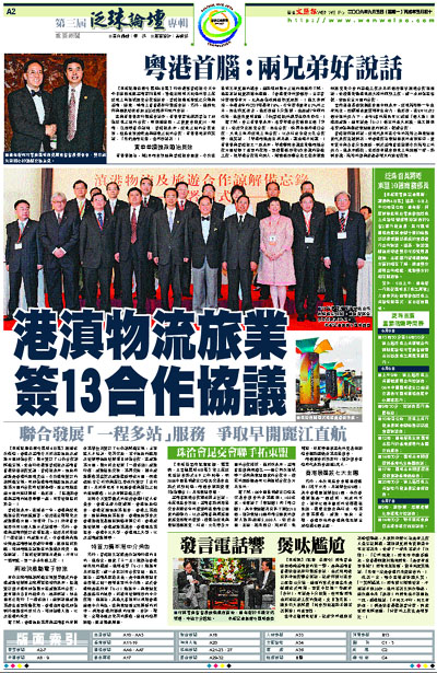 【本報記者葉傲冬昆明4日電】經過多次磋商,香港及雲南今天同意在物流及旅遊方面加強合作,雙方簽訂了13份合作諒解備忘錄,並由行政長官曾蔭權及雲南省省長徐榮凱作見證。曾蔭權表示,物流和旅遊是香港的經濟支柱,今次港滇簽訂的諒解備忘錄,可加強港滇兩地在物流及旅遊業方面的合作和發展基礎,建立兩地在這方面的夥伴關係。他形容:「協議將香港與雲南的城市串聯一起,可望發揮協同效益。」