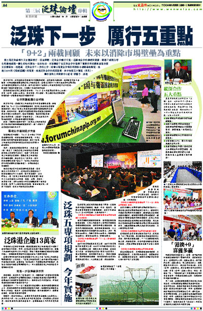 第三屆泛珠論壇今天在雲南舉行,回首兩載,泛珠合作暢行千里。這區域合作的構想與實踐,順應了經濟全球化和區域經濟一體化的時代潮流。在此時刻,本報專訪了在泛珠合作中發揮了重要作用的廣東省發改委主任陳善如,他透露:泛珠合作下一步的工作,將會以落實合作項目和消除市場壁壘為重點,推進CEPA和《框架協議》的落實,推進泛珠合作向縱深發展,其中包括五大重點。