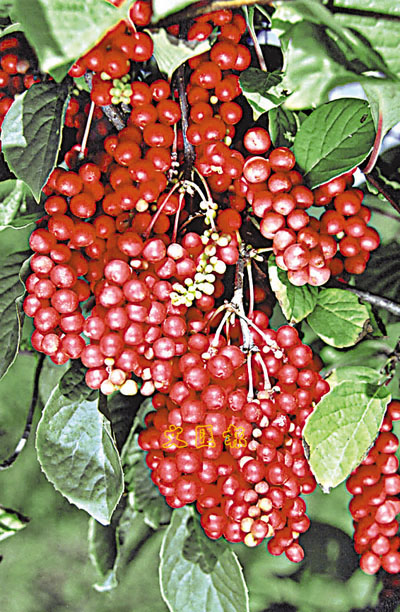 五味子(Schisandra chinensis)是一種帶香氣的木質藤本植物,葉子為橢圓狀,球形果實聚結成穗狀。五味子已乾的果實呈黑色,附有兩塊腰果形的葉片。據中醫典籍的記載,五味子果實的不同部分包含了五行——金、木、水、火、土各代表的味道——辛、酸、鹹、苦及甜,所以叫做五味子。