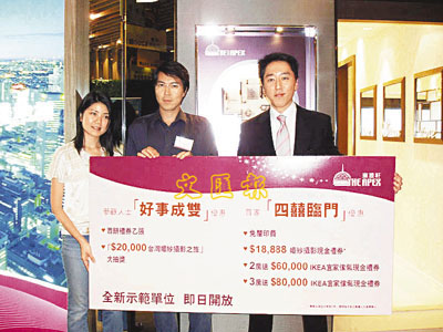 ■長實營業經理梁焯鏗(右)與宜家傢俬代表宣傳新優惠。本報記者周穎 攝