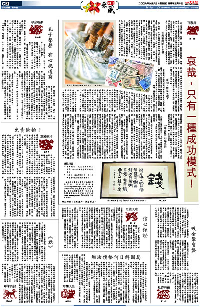從上面的不厭其煩的引述裡,大家可以看到,我們這些小孩子從來沒有當一個攤販的理想。攤販,小商小販,一直是被我父親一輩的人所鄙視的對象。這小商小販,往大裡說,往好的方面講,是商人—但是,他們歸根結底,搞的是投機倒把的勾當。我父親受的是正統的影響,對他們的好感自然很少。不料時代的變化出人意料。自從內地搞經濟改革以來,小攤小販的地位是暴雨灌溝,地位高漲。店小二變成了老闆,成了老總—這在當年的革命電影裡,可是只有十大元帥才配享有的尊稱—昇華成了CEO。各類媒體的目光,都聚焦在了他們的身上,那些美輪美奐的名詞,像土方車卸貨般傾瀉在他們的腦袋上:成功人士、尊貴人士、高尚人士、上流人士,等等等,這些腦滿腸肥的傢伙,衣著光鮮得就像天天出席APEC會議一樣。當年頗受我父親歧視的店小二,就這樣,一下子凌駕於萬千世界的芸芸眾生之上,儼然成了我們這些小民的所有想像力的極限目標。我們的成功模式,從眾說紛紜變成了眾口一詞:成功,就是有錢!