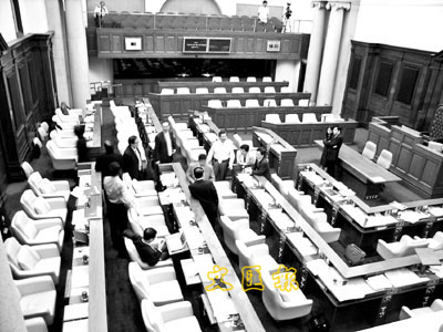 ■何鍾泰昨在立法會發言時,因為唐英年遲到未有出現,議會被叫暫停二十分鐘。圖為暫停的議事廳。 本報記者曾少妍 攝