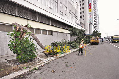 ■現場街道多棵大樹被吹斷或連根拔起。 本報記者蔣焯文 攝