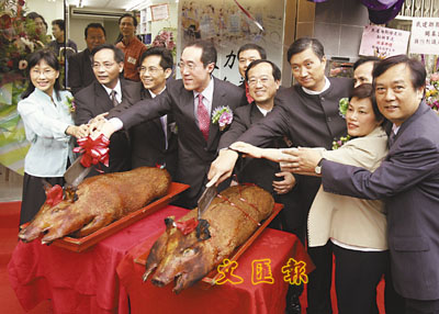 ■唐英年與嘉賓主持切燒豬儀式。 本報記者潘達文 攝