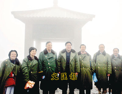 ■左起:李華、車書劍伉儷、高祀仁主任、張國良、呂明華、黃華康風雨交加登泰山。