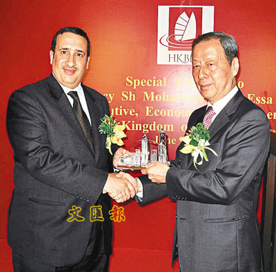 ■巴林王國駐港名譽領事周亦卿(右)致送紀念品予H E Sh Mohammed。本報記者沈清麗 攝