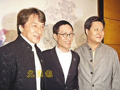 ■成龍出席派對,北京天恆拓展總裁李建國(右)及設計師陳幼堅上前恭迎。
