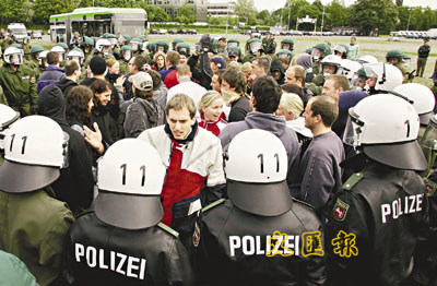 ■公署網頁提醒香港球迷,到外國捧場要遠離足球流氓。圖為德國警察控制足球流氓。
