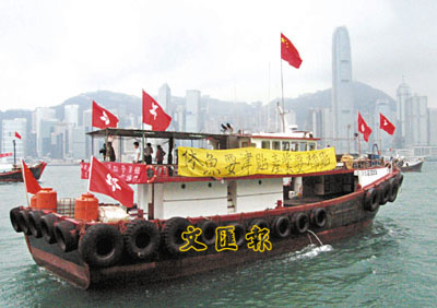 ■香港漁民自駕船隻在維多利亞港巡遊,向政府表達訴求。中新社