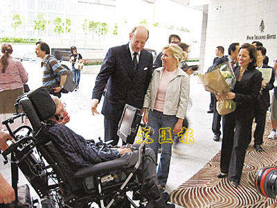 霍金與女兒及護理人員,連同隨行的廿多件行李昨日下午近5時抵達四季酒店,但酒店方面未有明顯加強保安,在訪問團到達前,才有約20名工作人員於大堂準備簡單的歡迎儀式。