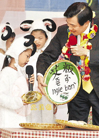 台北市明德小學昨日舉行「客語日」活動,市長馬英九(右)用客家話介紹客家美食。中央社