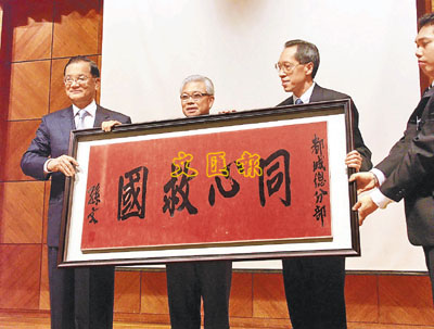 ■國民黨榮譽主席連戰今天贈送孫中山手書「同心救國」匾額複製品給新加坡中華總商會會長蔡天寶(中)和華裔館館長廖建裕(右一)。中央社