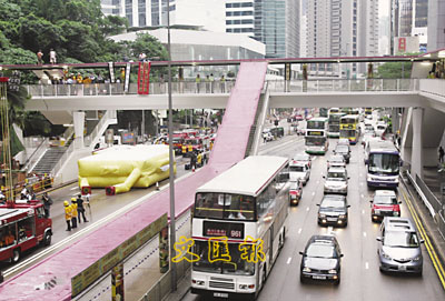 【本報訊】一批爭取子女居港權的示威者昨午發起遊行抗議,原定由灣仔入境事務處遊行往政府總部,沿軒尼詩道途至軍器廠街時橫生枝節,其中4名中年男子突然跑上行人天橋後,爬上橋頂垂下標語抗議,由於4人在橋頂危立及揚言跳橋,警方將軒尼詩道西行3條行車線封閉以便消防張開救生氣墊戒備,正值下班繁忙時間,導致交通嚴重擠塞,有12條巴士線要改道,至今晨零時,對峙近8小時後,最後一人終願下來。有為此蒙受塞車之苦的市民怨聲載道,批評示威者不應採取如此過激的手法示威。