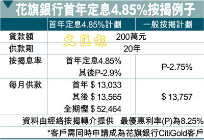 【本報訊】(記者 周穎)為在按揭市場分一杯羹,經絡與花旗銀行合作推出首年定息4.85厘,期後P減2.9厘,P為8.25厘。該付款計劃適用於一、二手及轉按物業。