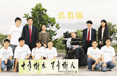 【本報訊】霍金明天將為科大高等研究院主持創立後的首場講座,所以他昨日除出席記者會「回答」記者問題外,亦專程參加了該院的植樹典禮。他在科大校長朱經武、副校長(行政及總務)黃玉山、高研院執行主任余珍珠及多名學生代表的陪同下,見證了植樹的澆水儀式。