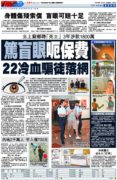 【本報訊】本港廉署首次揭發殘忍地弄盲眼睛以詐騙保險賠償案件,搗破一個涉及保險從業員與西醫合謀的跨境詐騙集團。據悉,該集團先以收購得來的港人身份證投保,再招攬內地的赤貧人士自殘眼睛及身體,然後安排他們來港、利用買來的身份證在港就醫,並串謀一名註冊西醫提供虛假資料,向保險公司騙取巨額保險賠償,涉及保金高達1800萬元;至於受聘自殘的內地人,僅獲得20至30萬元的報酬。廉署接獲舉報展開調查後,連續兩天展開「明燈行動」,共拘捕22名男女,包括一名註冊西醫。