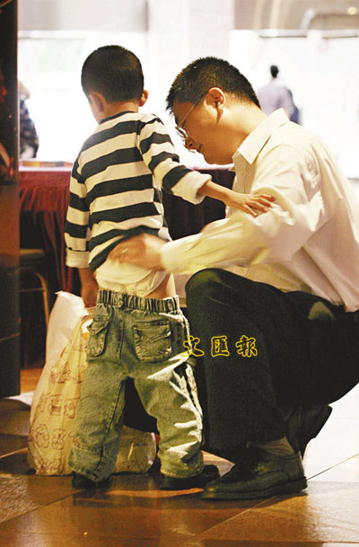■除了工作之外,父親的一雙手還要幫兒子穿褲啊!本報記者趙焜崗 攝