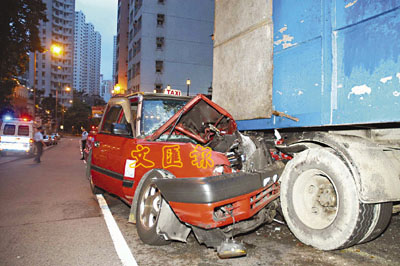 【本報訊】身體不適5歲男童禍不單行;昨凌晨由母親陪往醫院求診後,截乘的士回家途至北角天后廟道上斜時,疑司機打瞌睡直撼一輛停在路邊垃圾車尾,的士車頭嚴重毀爛,因衝力猛烈,坐在後座的男童雖躺在母親懷中,整個人仍遭拋前撼向車頭擋風玻璃,當場頭破血流重創,其母及的士司機亦頭面受傷披血。由於世界盃期間,不少球迷為觀看球賽致睡眠不足,警方正調查意外是否與此有關。