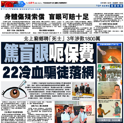 【本報訊】本港廉署首次揭發殘忍地弄盲眼睛以詐騙保險賠償案件,搗破一個涉及保險從業員與西醫合謀的跨境詐騙集團。據悉,該集團先以收購得來的港人身份證投保,再招攬內地的赤貧人士自殘眼睛及身體,然後安排他們來港、利用買來的身份證在港就醫,並串謀一名註冊西醫提供虛假資料,向保險公司騙取巨額保險賠償,涉及保金高達1800萬元;至於受聘自殘的內地人,僅獲得20至30萬元的報酬。廉署接獲舉報展開調查後,連續兩天展開「明燈行動」,共拘捕22名男女,包括一名註冊西醫。