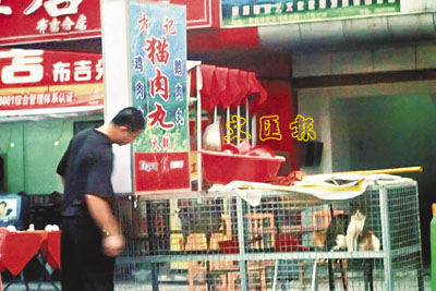 ■店主將燈箱放置在高處招攬顧客,籠子內裝著3隻等待顧客點殺的小貓。本報深圳傳真