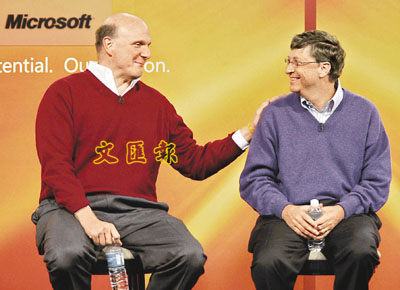 ■微軟創辦人蓋茨(右)前日宣布不再執掌日常營運,將專注打理慈善基金,微軟行政總裁鮑爾默(左)將擔正。 美聯社