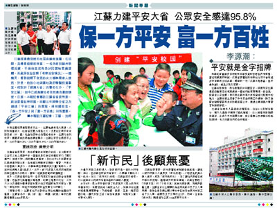 江蘇省委常委、政法委書記林祥國告訴記者,讓進入城市的務工人員享受「市民待遇」,才能使他們真正融入城市,成為「城市新市民」:為了讓他們具備在城市謀生的技能,適應城市的競爭環境,江蘇省實施了「百鎮百萬」和「千校百萬」就業培訓計劃;為解決後顧之憂,江蘇全省以公辦學校為主解決新市民子女入學問題,目前全省各類公辦小學初中已接受39萬外來務工者子女入學,創辦民工子女學校227所;同時,全省為「新市民」興建居住公寓1,400多萬平方米。