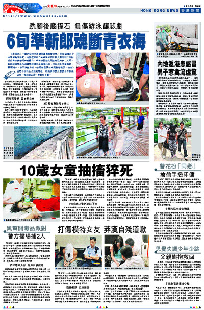 游泳遇溺身亡準新郎陳立人,61歲,內地安徽人。現場消息稱,陳是一名準新郎,與香港一名姓鄭婦人(56歲)譜奏黃昏戀曲;雙方互相愛慕,不理世俗眼光,準備於今日舉行婚禮,陳亦於日前持雙程證來港,居住在女友位於青衣的住所。
